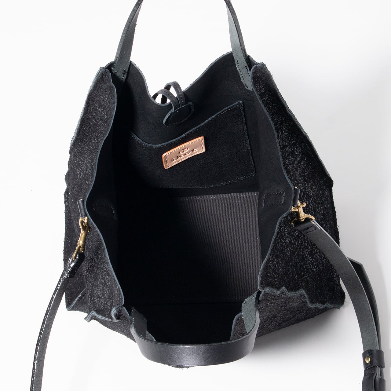 床面にクラックの箔加工を施し、ひび割れた粗い印象を表現したオリジナルのクラッキングレザー。その印象とは対照的になめらかな柔らかさが特徴です。