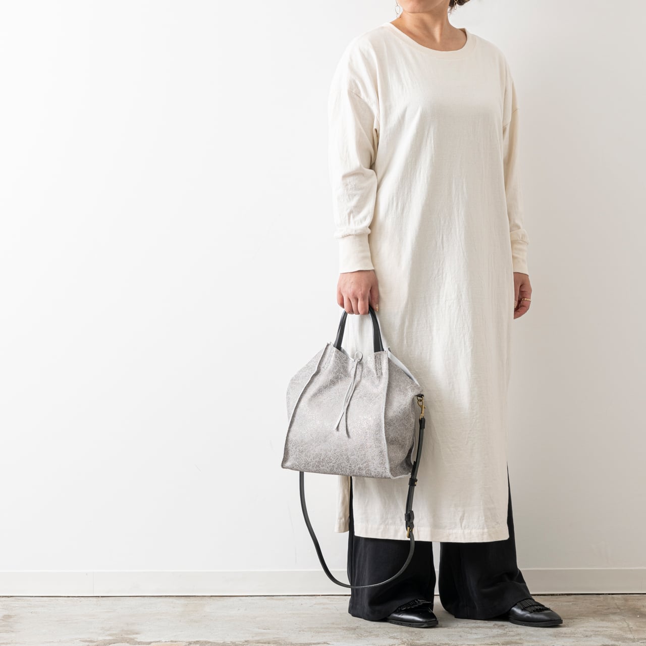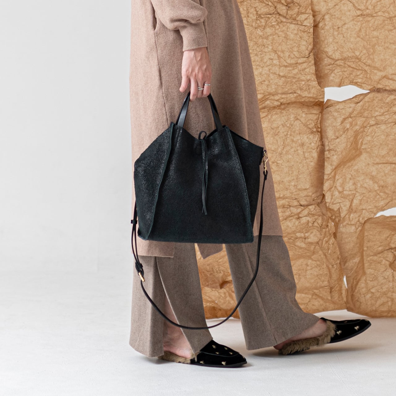 ハンドルとショルダー部分はヌメ革でアクセントを効かせました。ショルダーは取り外してハンドバッグとしても使える2WAY仕様。程よく遊び心の効いたシルエットで、コーディネートのワンポイントになりながらも、どんな装いにも合わせやすくおすすめです。日常使いからキチンとしたシーンまで幅広く使えます。